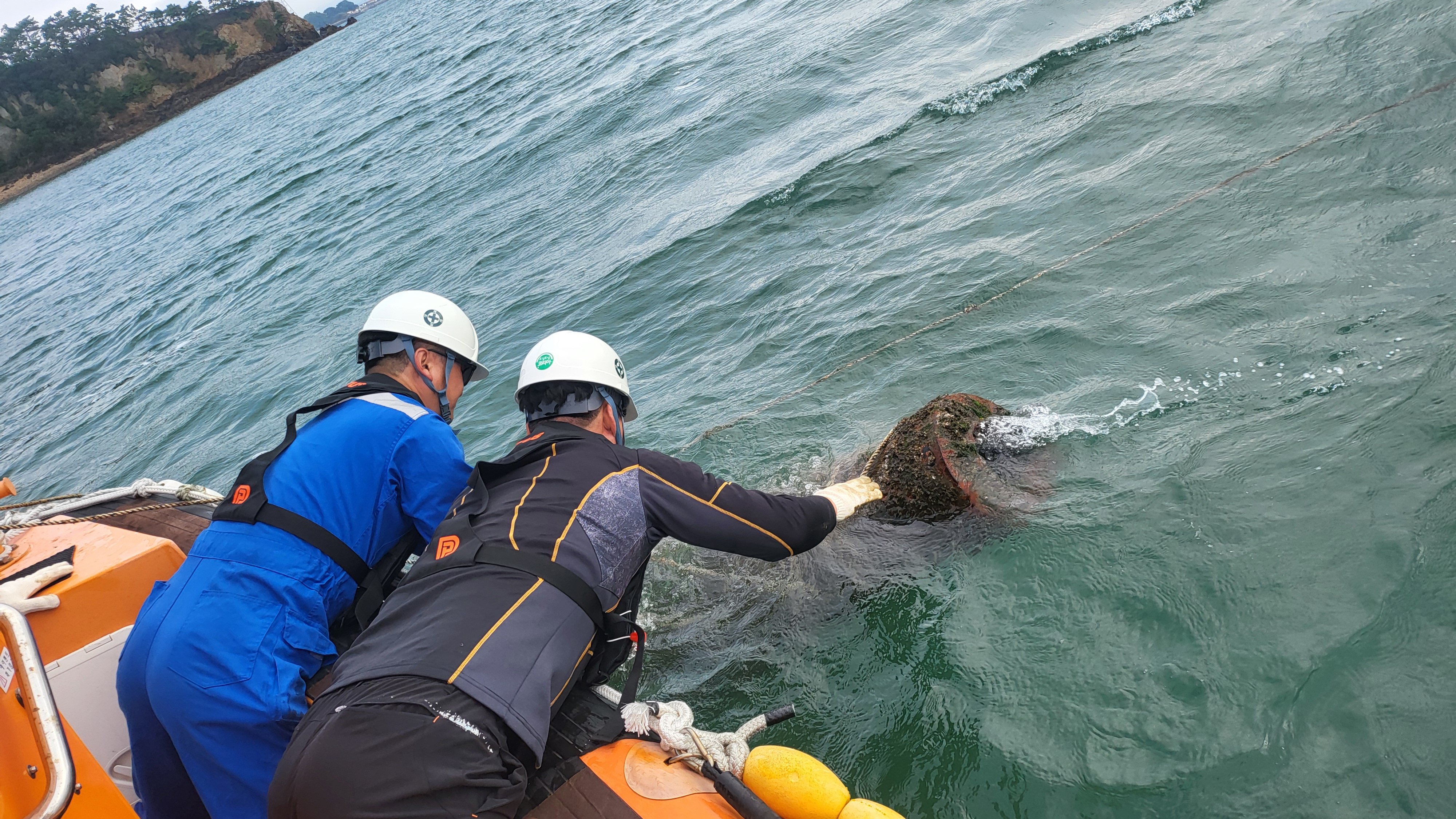 이 같은 상황을 감안, 도는 항행 선박 안전사고 예방을 위해 환경정화운반선인 늘푸른충남호를 긴급 투입, 보령해경 잠수구조대와 합동 작업을 통해 기초파일을 인양- 예인해 관할 보령시에 인계했다.