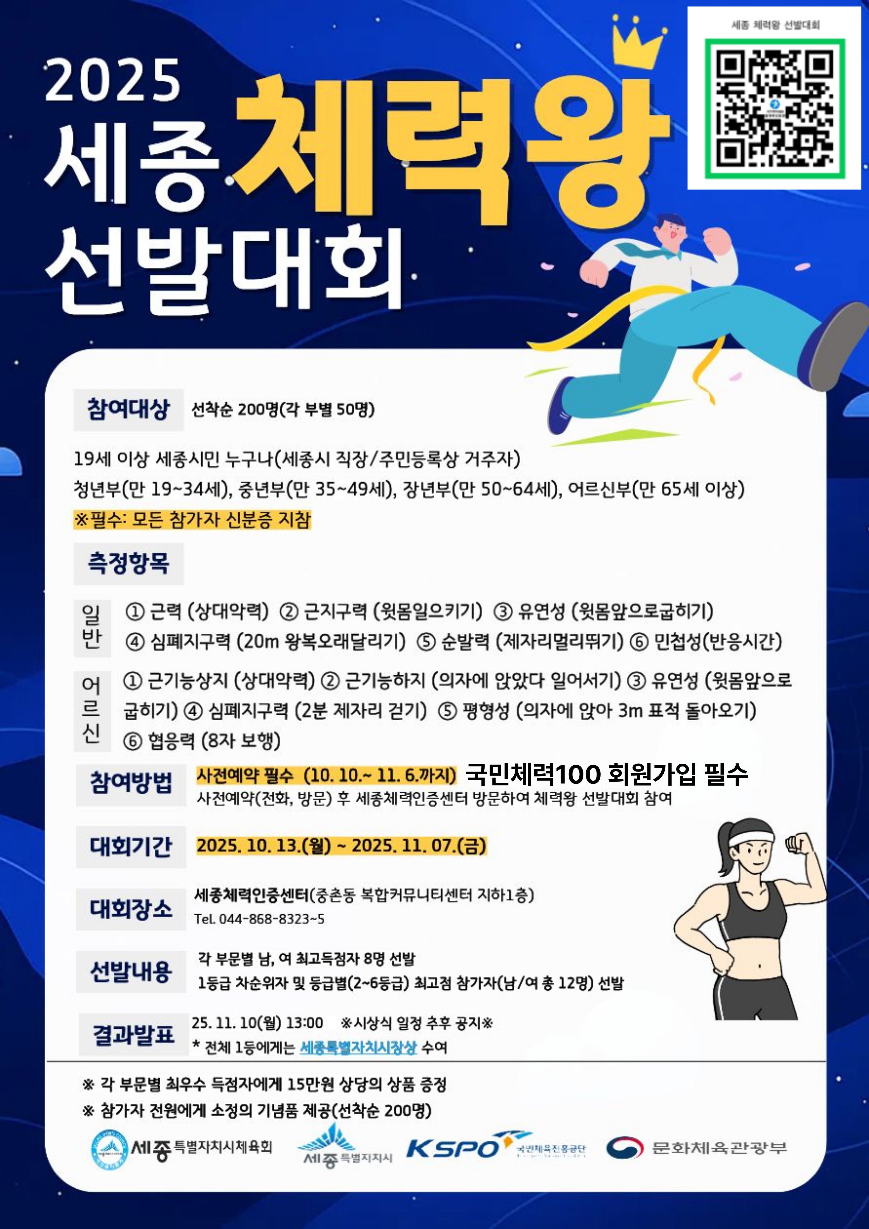 [세종타임즈] 세종시체육회는 시민의 건강증진과 생활체육 참여 확대를 위해 국민체육진흥공단 및 세종시의 재정 후원을 받아‘2025년 세종 체력왕 선발대회’를 오는 10월 13일부터 11월 7일까지 개최한다.