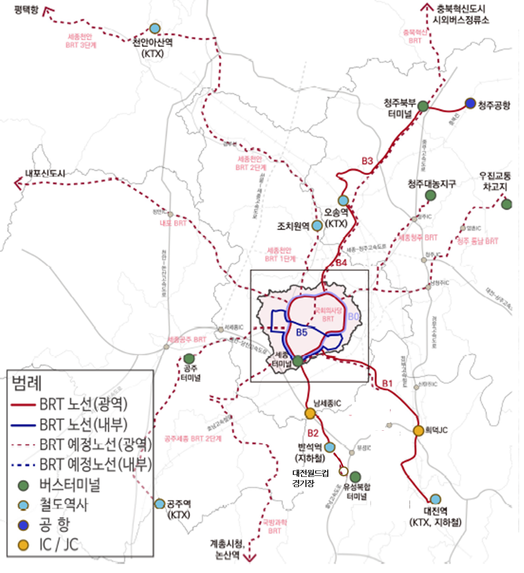현재 바로타는 ▶세종시 내부 순환 2개 노선과 ▶대전·청주·공주 등지를 잇는 6개 광역노선(이 중 2개는 전용차로율 70% 미만)으로 운행 중이다. 최근에는 공주 방면 노선 공사가 본격화되며, 충청권 555만 메가시티의 대중교통 대동맥 역할을 강화하고 있다.