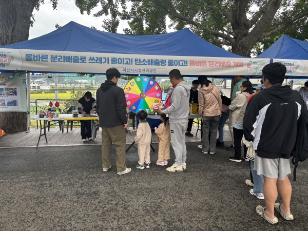 ‘올바른 분리배출 게임’은 분리배출 시 구분하기 어려운 폐기물의 모형을 가지고 성상에 따라 분류하는 퀴즈를 맞추는 체험형 교육프로그램으로 ‘2025년 아산 환경교육 한마당 행사’를 방문한 시민 중 550명이 참여해 올바른 분리배출에 대한 교육 및 탄소중립 생활실천을 활성화하는 좋은 기회가 됐으며 또한 참여자에게는 친환경 굿즈 등 다양한 홍보물을 제공해 많은 호응을 받았다.