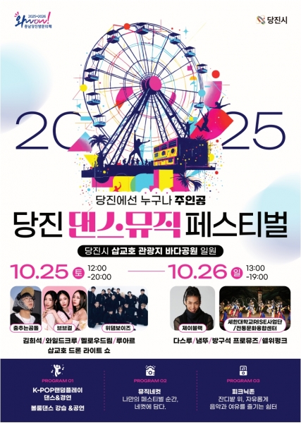 [세종타임즈] 당진시가 오는 25일과 26일 이틀간 삽교호 관광지 바다공원 일원에서 ‘2025년 당진 댄스&뮤직 페스티벌’을 개최하며 '춤과 음악으로 하나 되는 당진, 당진에선 누구나 주인공'이라는 주제로 화려한 가을 축제의 장을 펼친다.