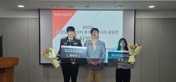 우수상은 △박재윤 씨의 ‘충남형 기후재난 취약계층 맞춤형 안전망 구축을 위한 데이터 분석’ △천호영 씨의 ‘실시간 IPTV 시청 데이터 분석을 통한 사회적 취약계층 고립예방’ △복상균 씨의 ‘충남형 폐가·빈집 DB 분석 기반 주거·농지 회복 플랫폼’ △정영주 씨의 ‘데이터 기반 충남형 수해·침수 위험 예측 및 스마트 경보 시스템’ △임정현 씨의 ‘농촌 고령화 대응 스마트 복지 예측지수 기반 돌봄 사각지대 조기감지 시스템’ 이다.