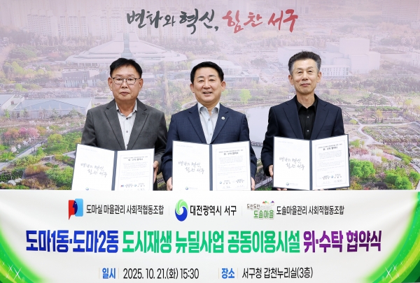 [세종타임즈] 대전 서구는 도마1동 도마실마을관리 사회적협동조합 및 도마2동 도솔마을관리 사회적협동조합과 ‘도마1·2동 도시재생 공동이용시설 운영 민간 위탁 협약’을 체결했다고 22일 전했다.