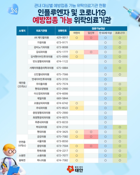 아울러 만 60~64세 군민을 비롯해 기초생활수급자, 심한 정도의 장애인, 국가유공자 등 태안군 자체 예방접종 대상자의 경우 태안군에 주소지를 두고 있어야 한다.