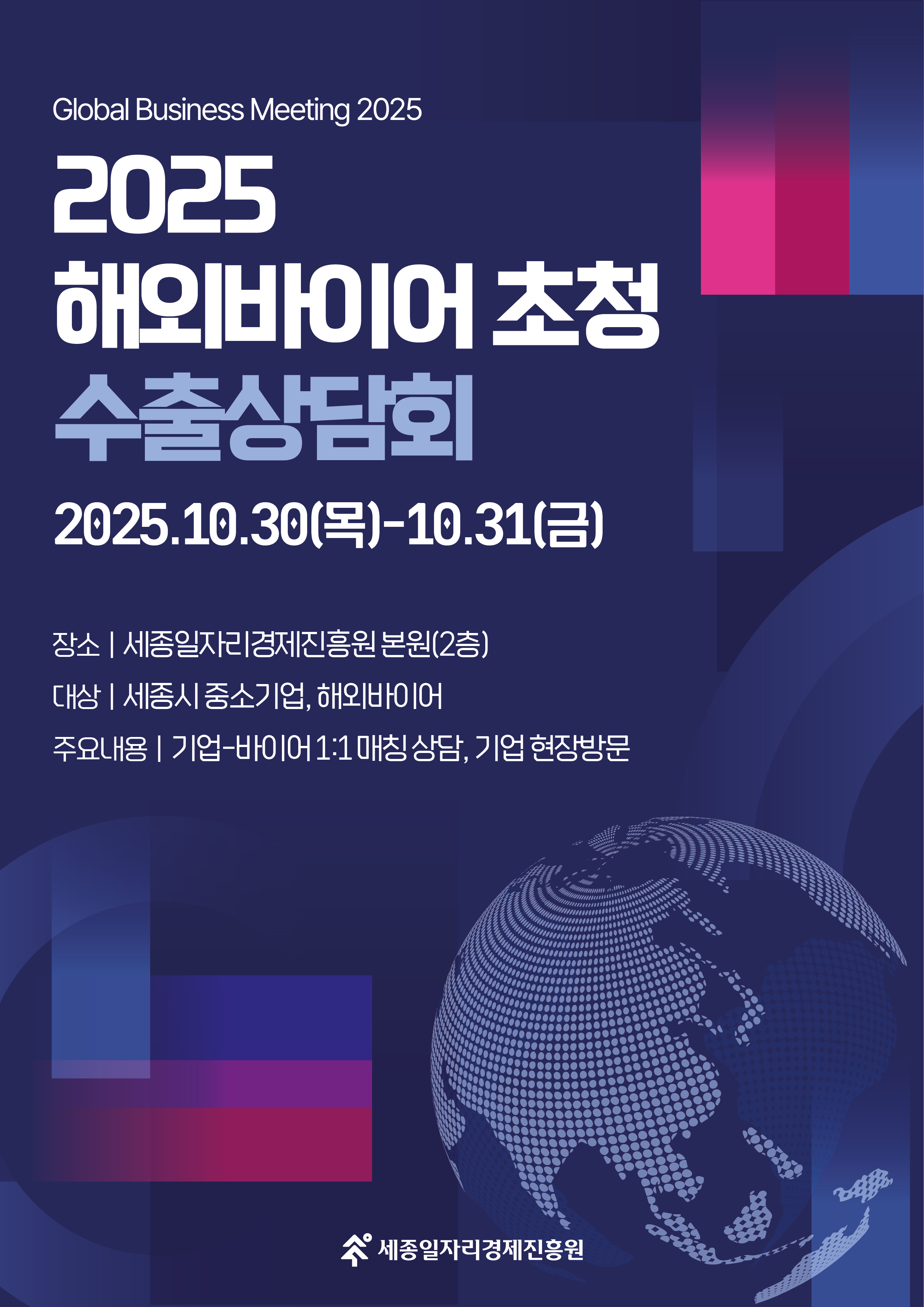[세종타임즈] 세종일자리경제진흥원은 오는 10월 30일부터 31일까지 이틀간, 진흥원 본원에서 ‘2025 해외바이어 초청 수출상담회’를 개최한다고 밝혔다.