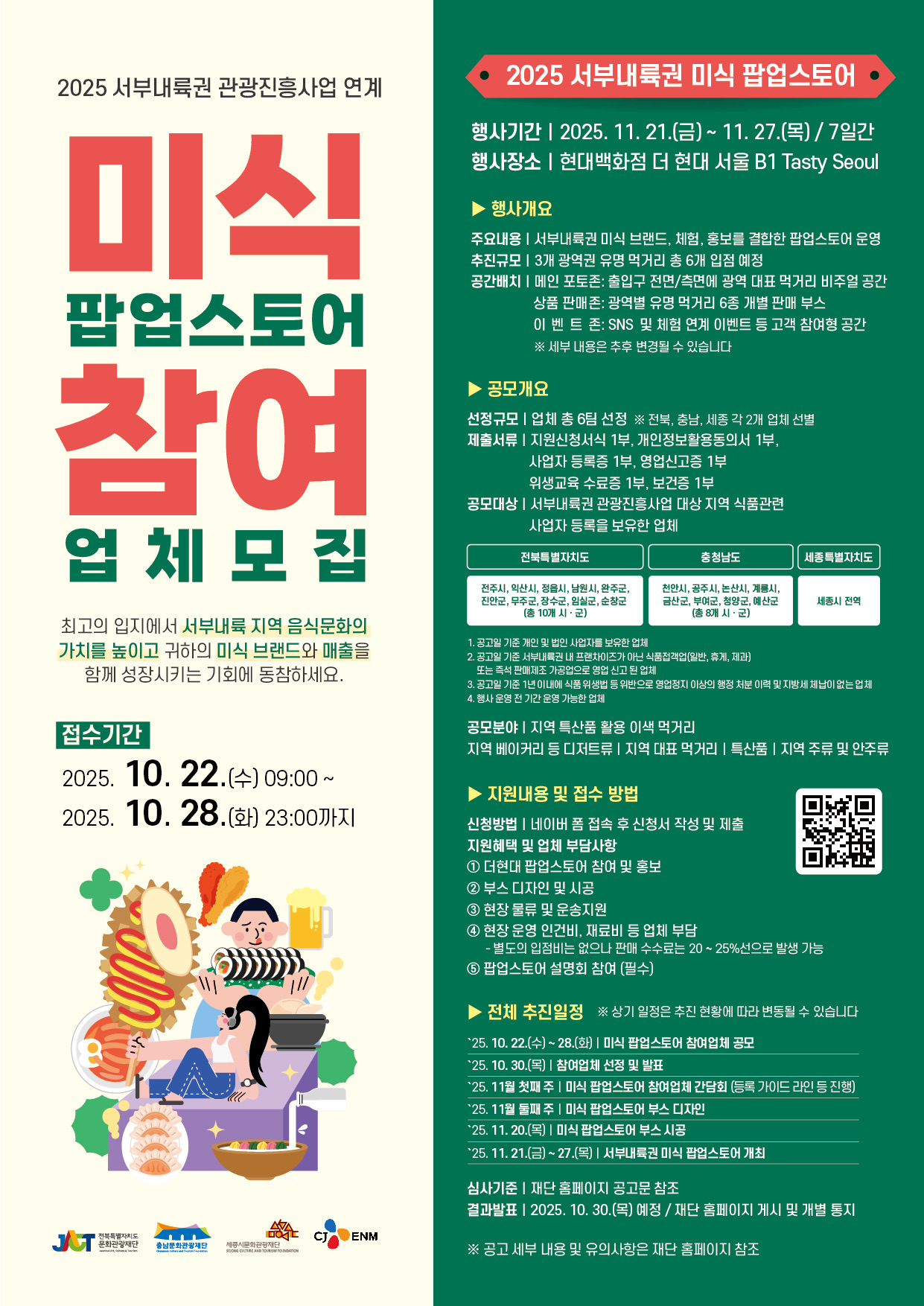 모집 대상은 서부내륙권(세종·충남·전북) 내 식품접객업 또는 즉석판매제조·가공업 사업자로, 프랜차이즈는 제외된다. 공고일 기준 1년 이내 식품위생법 위반이나 지방세 체납 이력이 없는 사업자여야 하며, 선정된 업체는 행사 전 일정에 참여해야 한다.