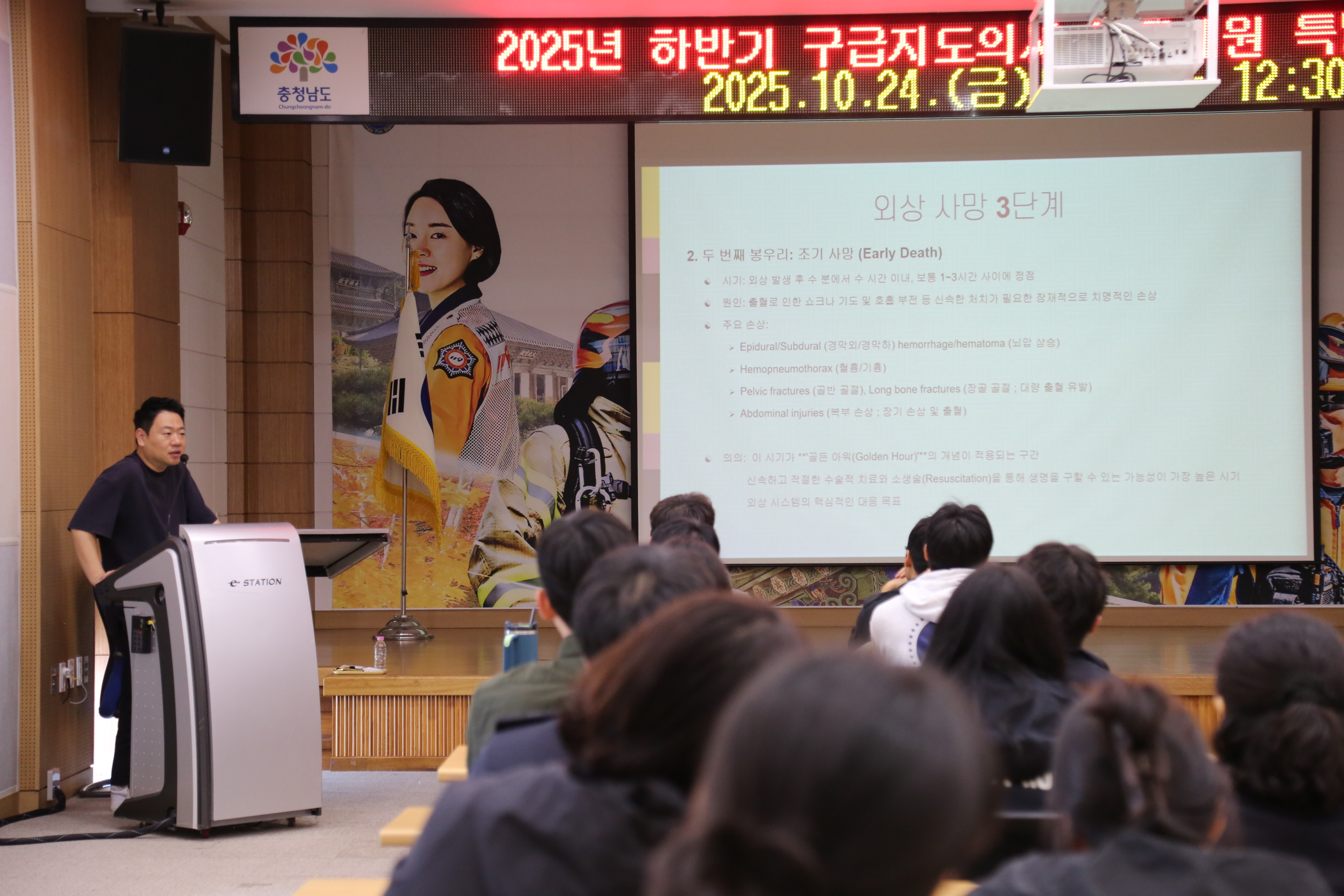 교육은 지난해 7월부터 공주소방서 구급지도의사로 위촉된 천안충무병원 응급의학과 안승배 과장이 직접 강사로 참여해 진행됐으며, ▶중증외상환자 응급처치법 ▶정맥로 확보의 중요성 ▶구급차 교통사고 및 안전사고 예방 ▶다수사상자 분류(S.T.A.R.T. triage) 절차 등 구급 현장에서 즉시 활용 가능한 핵심 내용으로 구성됐다.