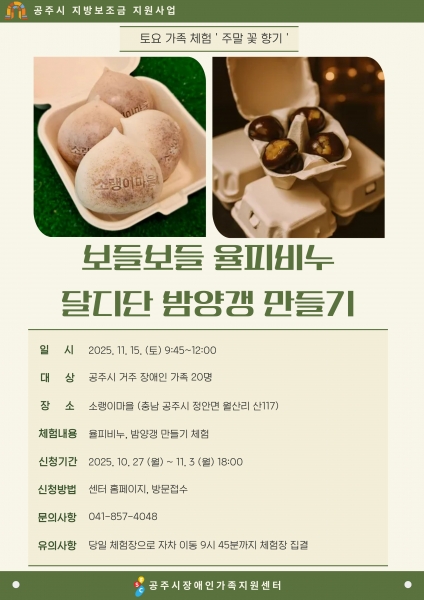 참여 가족들은 현장에서 밤을 활용한 율피비누와 밤양갱 만들기 체험을 통해 가족 간의 추억을 쌓는 특별한 시간을 보낼 예정이다.