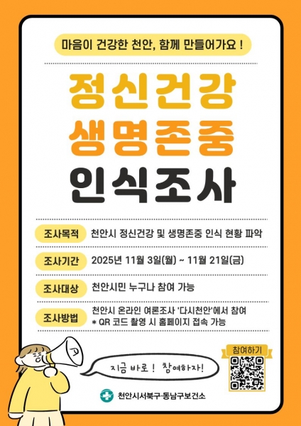 천안시는 이번 조사를 통해 시민들의 정신건강에 대한 관심을 높이고 생명존중 문화가 확산될 수 있는 마음이 건강한 지역사회 환경을 조성할 계획이다.