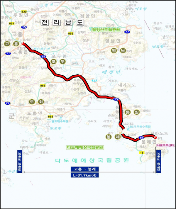 국토교통부는 ‘국도 15호선 고흥~봉래 확장사업’을 당초 계획대로 현재 수립 중인 제6차 국도·국지도 건설계획에 반영하는 대신, 기존 계획인 제5차 국도·국지도 건설계획에 해당 사업을 반영하기 위한 변경안을 마련했다.