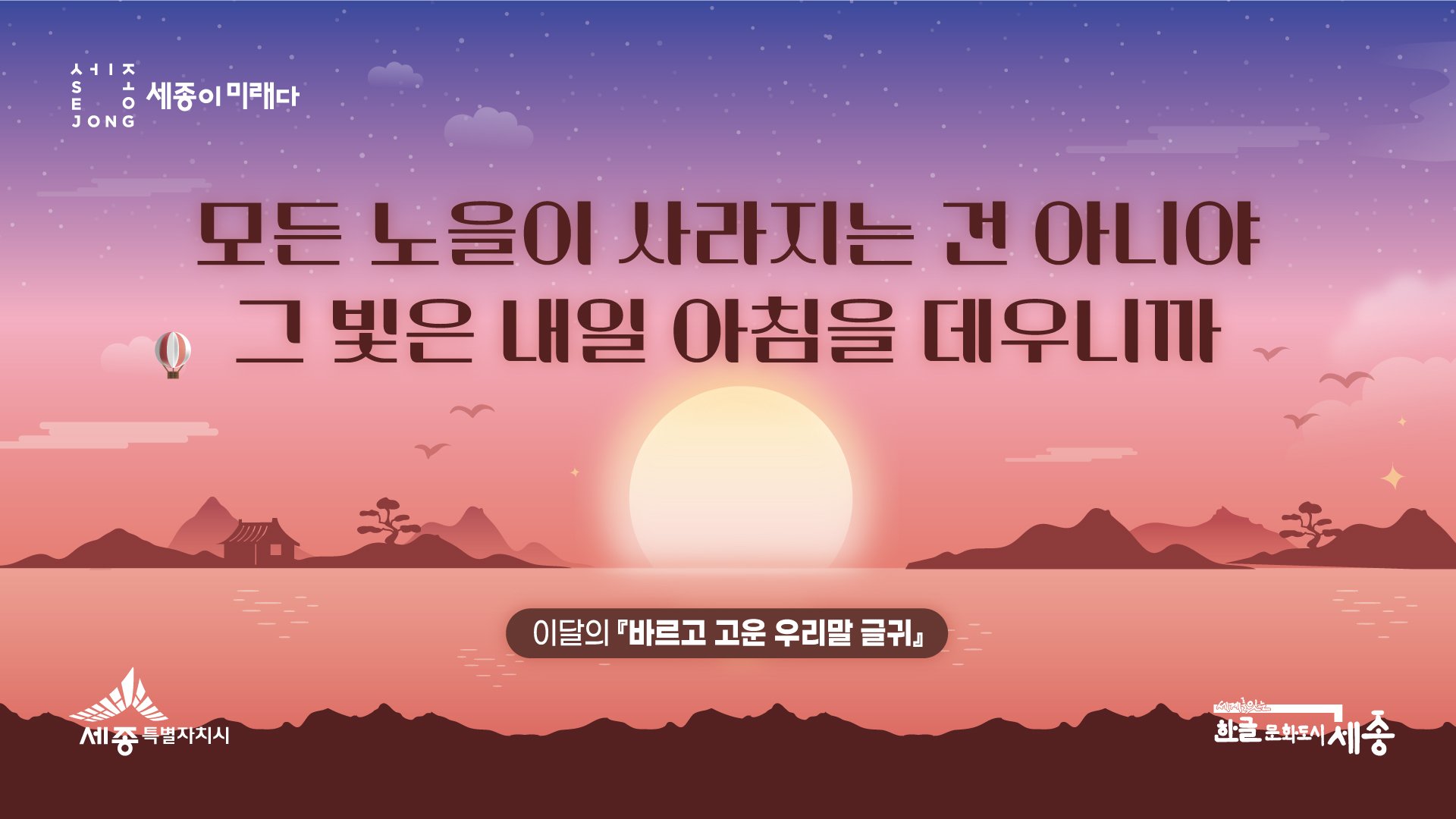 [세종타임즈] 세종특별자치시는 시민 참여를 통해 11∼12월 ‘바르고 고운 우리말 글귀’로 “모든 노을이 사라지는 건 아니야, 그 빛은 내일 아침을 데우니까”를 최종 선정했다고 밝혔다.