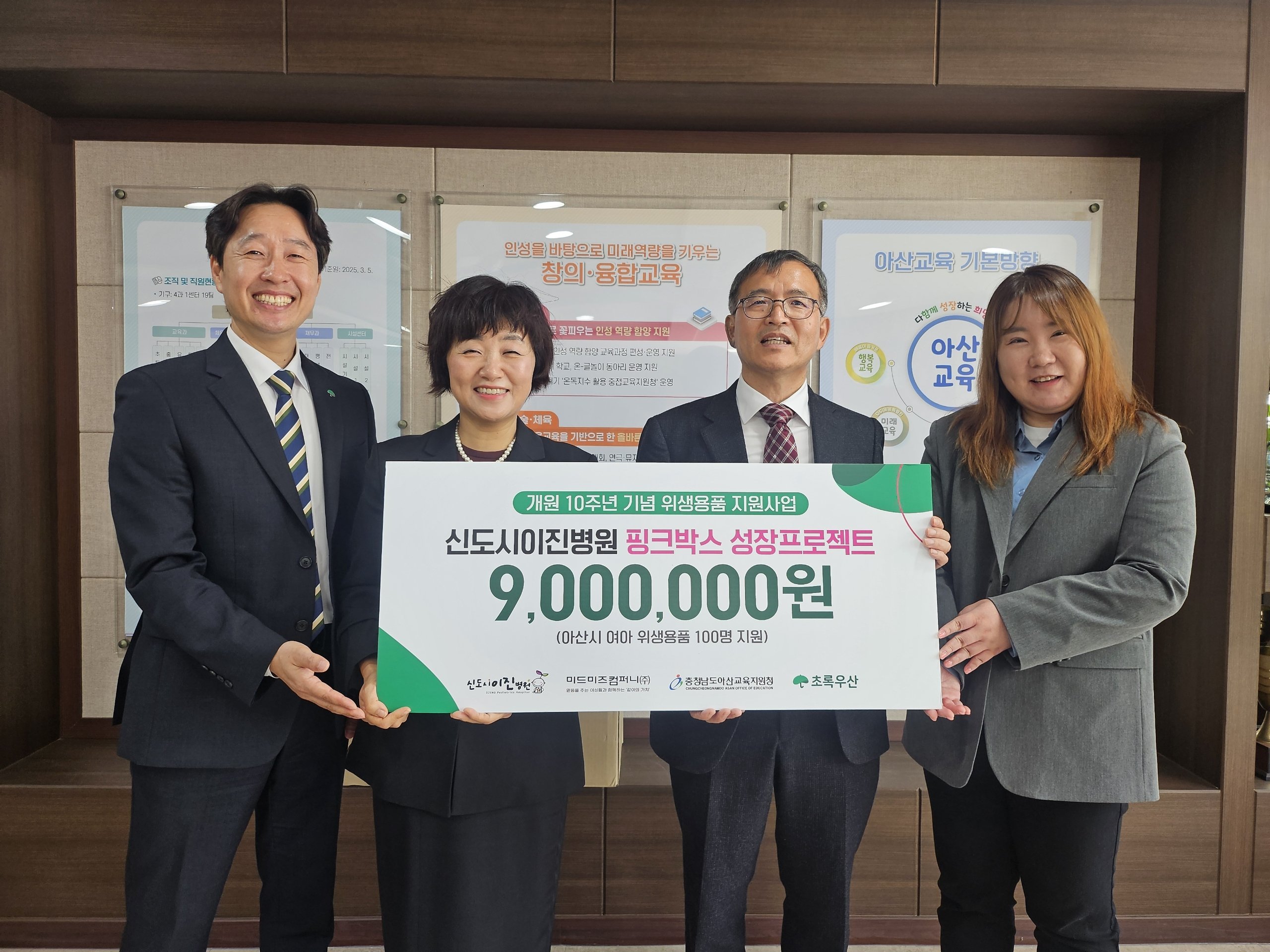 [세종타임즈] 아산교육지원청 교육복지지원센터는 5일 지역사회와 함께하는 교육복지실천의 일환으로 신도시이진병원으로부터 취약가정 100명 여학생에게 성장기 위생용품을 지원하는 ‘핑크박스 성장프로젝트’후원금 900만원을 전달받았다고 밝혔다.
