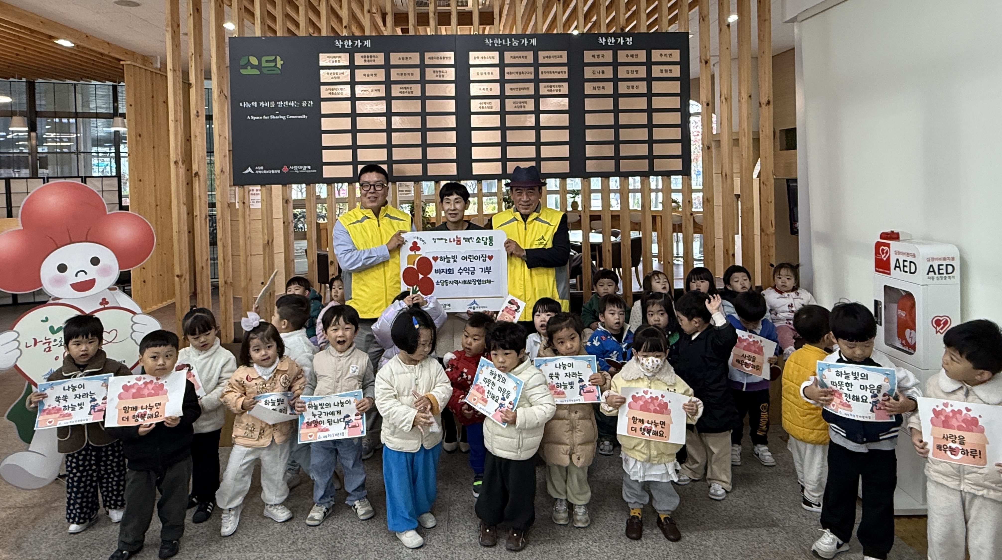 이번 기부금은 하늘빛어린이집이 지난달 30일 사랑의 바자회를 열고 원생과 학부모, 지역사회 소상공인이 참여한 가운데 의류·생활용품 등 다양한 물품을 판매하고 얻은 수익금 전액이다.