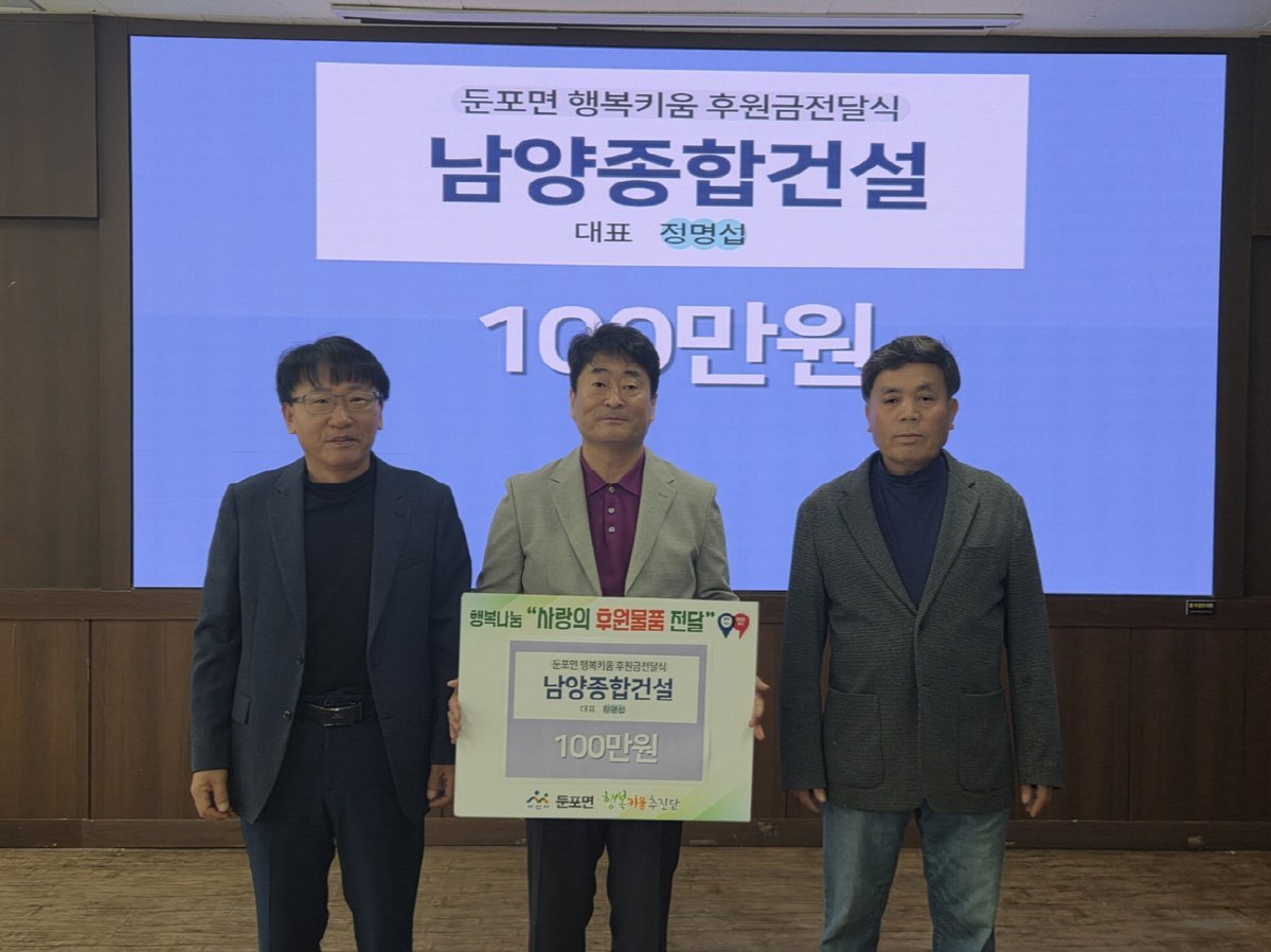[세종타임즈] 아산시 둔포면 행복키움추진단은 7일 남양종합건설㈜로부터 관내 취약계층 지원을 위한 이웃사랑 후원금 100만원을 전달받았다.