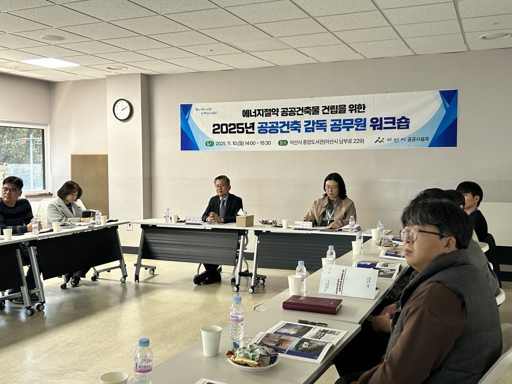 [세종타임즈] 아산시는 10일 중앙도서관에서 공공건축 감독 공무원들을 대상으로 ‘에너지 절약 및 친환경 공공건축물 건립 실무교육 워크숍’을 열었다.
