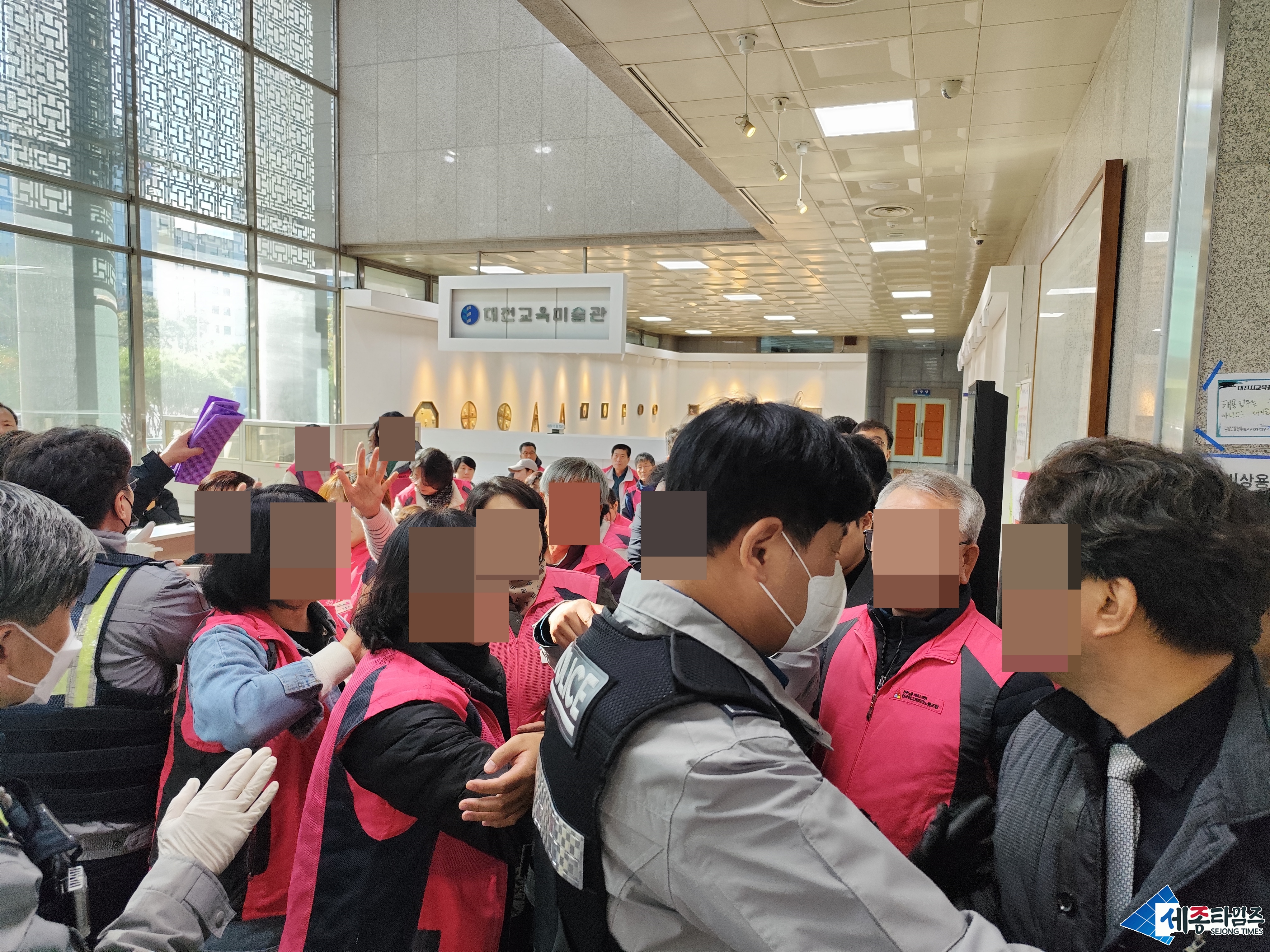 [세종타임즈] 대전교육청 측과 교섭을 주장하는 민주노총 서비스연맹 전국학교 비정규직 노동조합 대전지부 조합원들이 11일 대전교육청 1층 로비에서 서로의 주장을 요구하며 치열한 몸싸움을 벌였다.