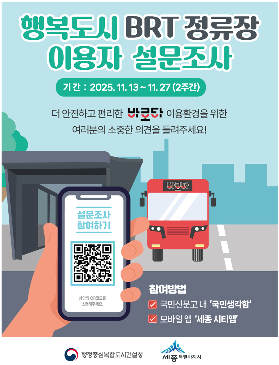 설문 참여는 온라인 플랫폼 ‘국민생각함’과 ‘세종시티앱’을 통해 가능하며, BRT 정류장에 설치된 LCD 전광판의 QR코드를 스캔하면 바로 설문 페이지에 접속할 수 있도록 했다. 이와 함께 행복청과 세종시 누리집, SNS 채널 등 다양한 경로를 통해 참여 방법을 안내할 예정이다.