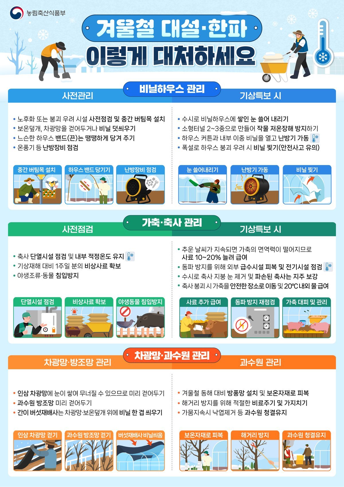 취약시설 중심으로 지주시설 설치·보강, 급수시설 피복, 난방장비 가동 상태 등을 점검하고, 재해 예방을 위해 원예·축사 시설 대상 내재해 설계기준 강화 및 표준설계도를 개선한다.