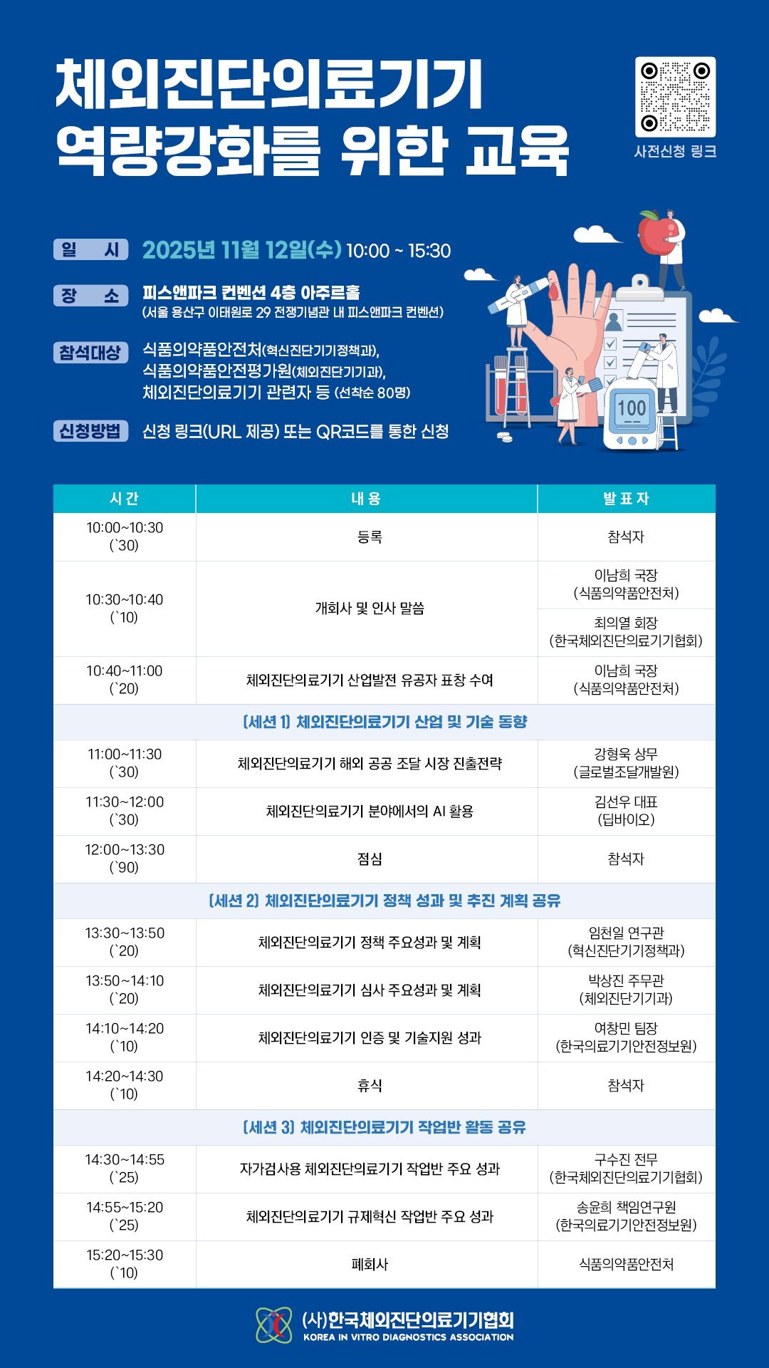이남희 의료기기안전국장은 “이번 행사는 체외진단의료기기 산업의 역량을 강화하고 업계와 소통할 수 있는 뜻깊은 자리”라며, “식약처는 앞으로도 지속적인 현장 소통을 통한 실질적인 정책지원 방안을 마련하고, 체외진단의료기기의 안전성 확보 및 품질 향상과 함께 국제경쟁력 강화를 위한 지원을 확대하겠다”고 밝혔다.