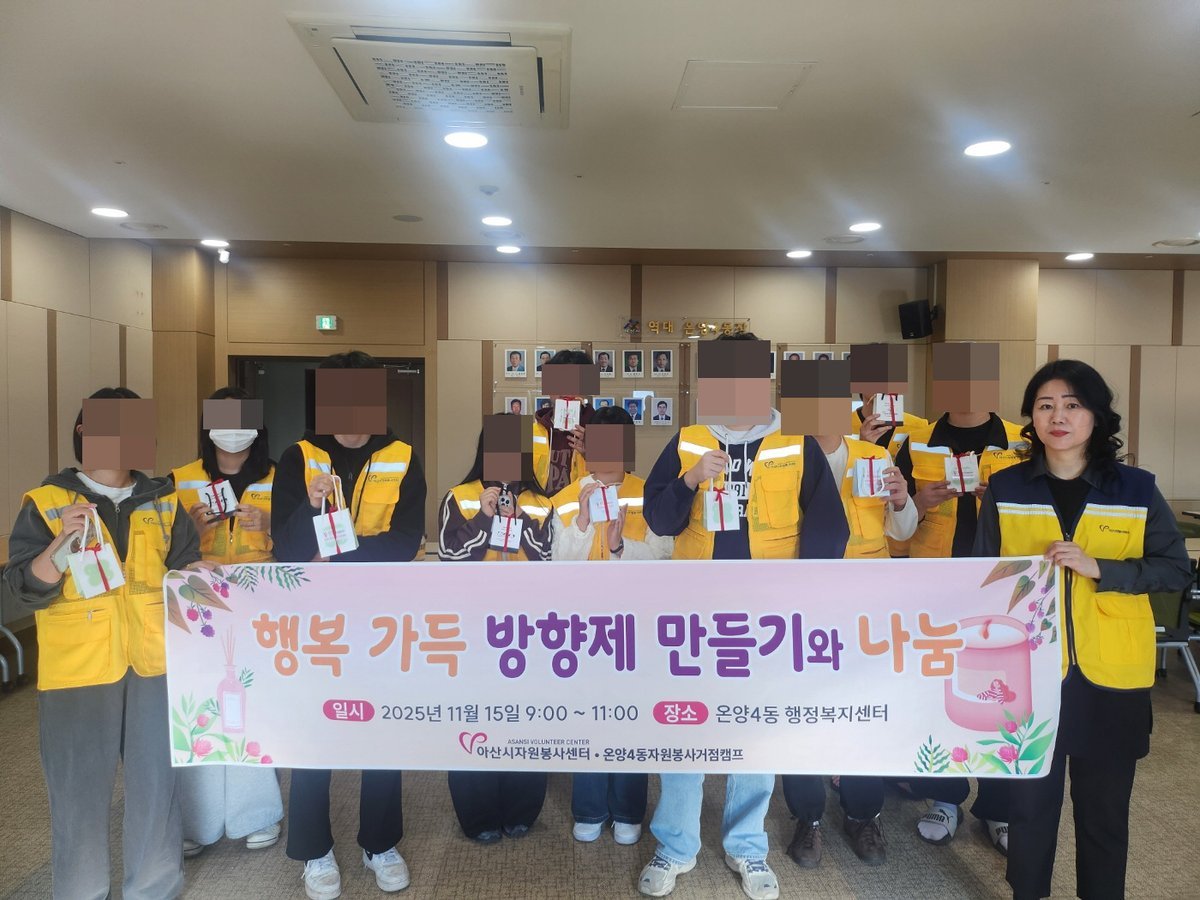 이번 활동은 아산시자원봉사센터의 예산 지원으로 추진됐으며 온양4동자원봉사거점센터 자원봉사자와 행복키움추진단원 10여명이 참여해 직접 향 조합과 꾸미기 재료를 활용한 디퓨저를 제작했다.