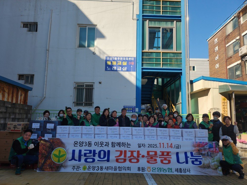임승근 온양3동장은 “추운 날씨에도 나눔을 실천해 준 새마을협의회 회원들과 후원해 주신 온양농협, 세흥상사 이종수 대표께 감사드린다”며 “행정에서도 복지 사각지대 발굴과 지원에 최선을 다하겠다”고 밝혔다.