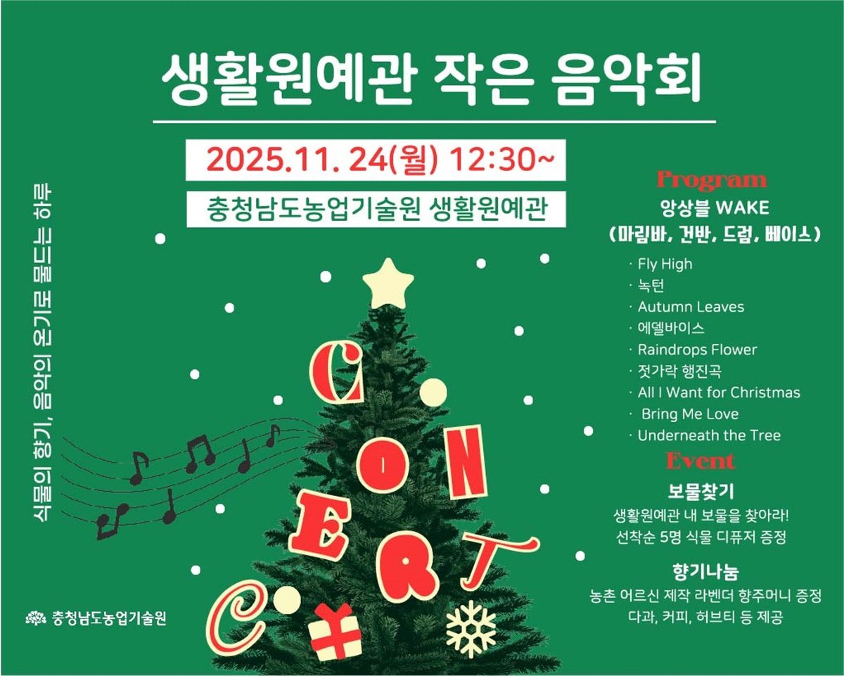 [세종타임즈] 충남도 농업기술원은 오는 24일 예산군 신암면 기술원 내 생활원예관에서 ‘작은 음악회’를 개최한다고 18일 밝혔다.