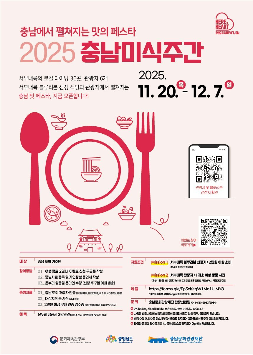 충남도· 충남문화관광재단, ‘2025 미식주간’선포--서부내륙권 8개 지역 음식점 관광지 방문 후 이벤트 응모시 2만원 지급