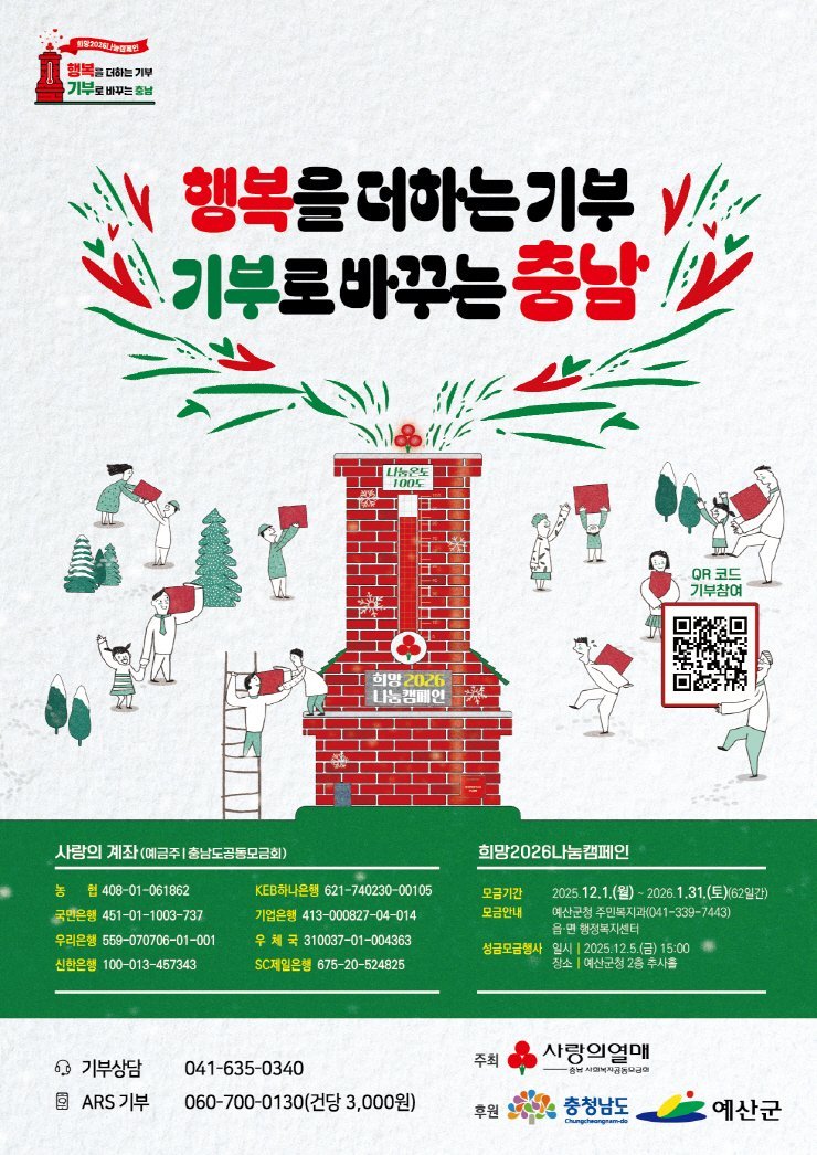 [세종타임즈] 예산군은 오는 12월 1일부터 내년 1월 31일까지 어려운 이웃에게 희망을 전하는 ‘희망2026 나눔캠페인’에 돌입한다고 밝혔다.