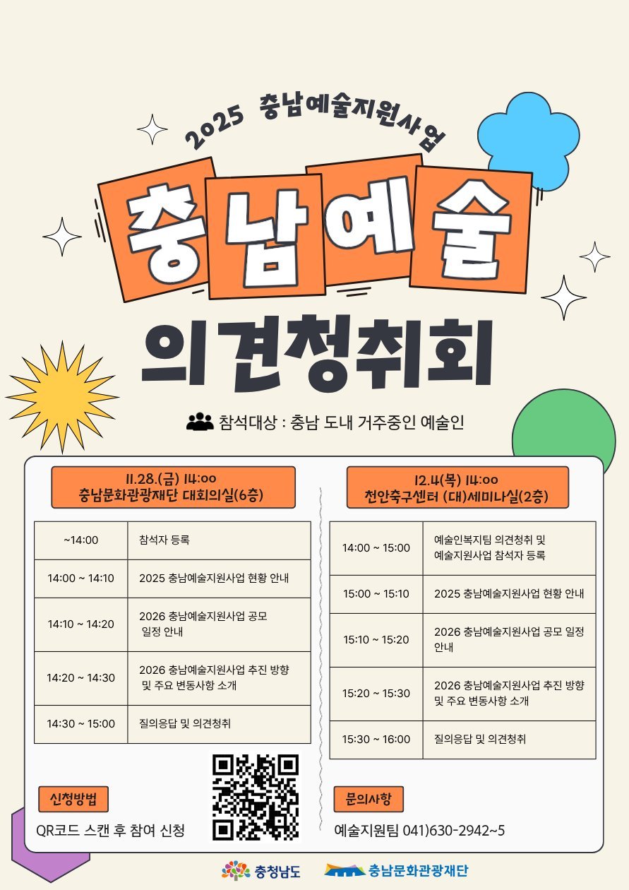 주요 프로그램은 △2025 충남예술지원사업 운영 현황 공유 △2026년 공모 일정 안내 △지원 방향 및 주요 변동사항 소개 △자유 의견 제시 및 질의응답 등으로 구성된다.