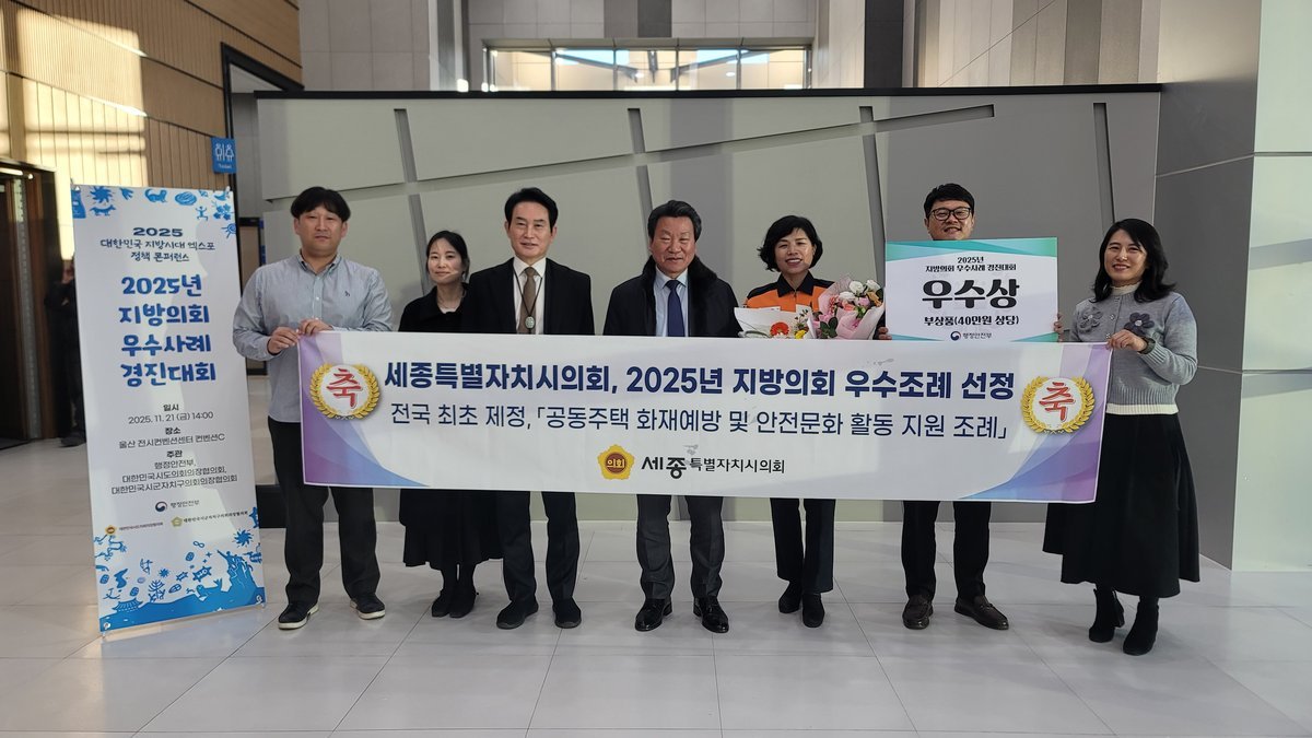 세종시의회가 전국 최초로 제정한「공동주택 화재예방 및 안전문화 활동 지원 조례」는 이날 대회에서 아파트 밀집 도시의 구조적 위험을 해소하기 위한 혁신 입법으로 평가받았다.