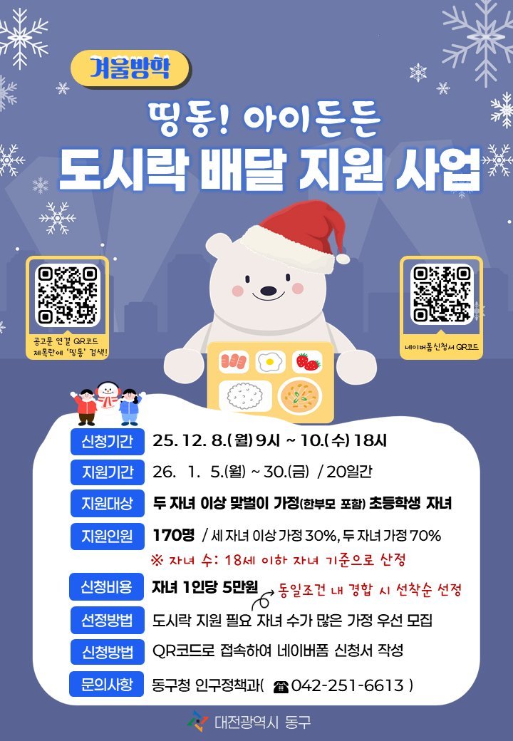 [세종타임즈] 대전 동구는 방학기간 동안 맞벌이 가정의 양육 공백을 해소하고 초등학생 자녀의 균형 잡힌 식사를 지원하기 위해 ‘겨울방학 띵동! 아이든든 도시락 배달 지원사업’의 신청자를 모집한다고 24일 밝혔다.