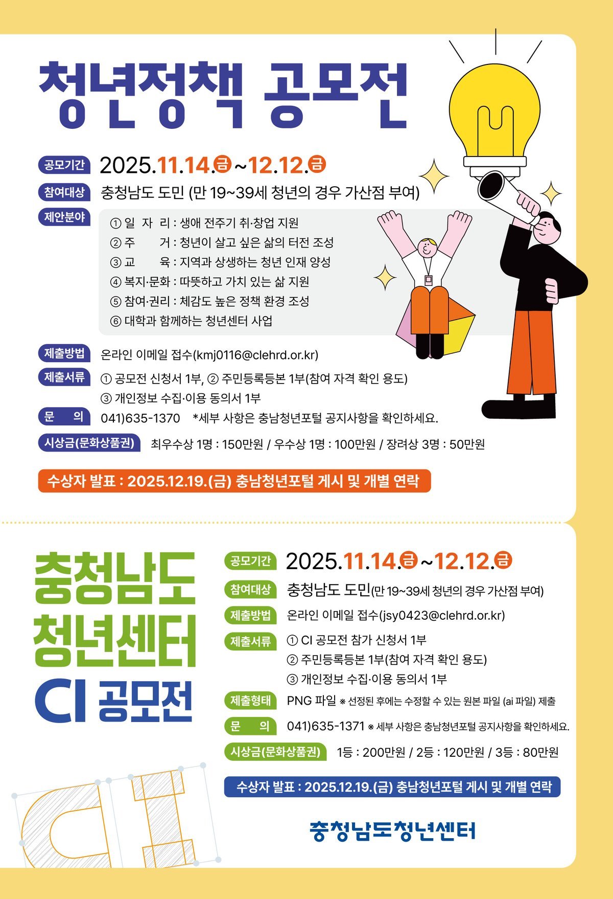 [세종타임즈] _청년정책 공모전 및 충청남도 청년센터 CI 공모전 홍보 포스터충청남도 청년센터는 충청남도 청년의 창의적인 의견을 수렴하고 청년 정책 활성화를 도모하기 위해‘2025 충청남도 청년정책 공모전’과 ‘충청남도 청년센터 CI 공모전’을 지난 11월 14일부터 12월 12일까지 동시에 개최한다고 밝혔다.