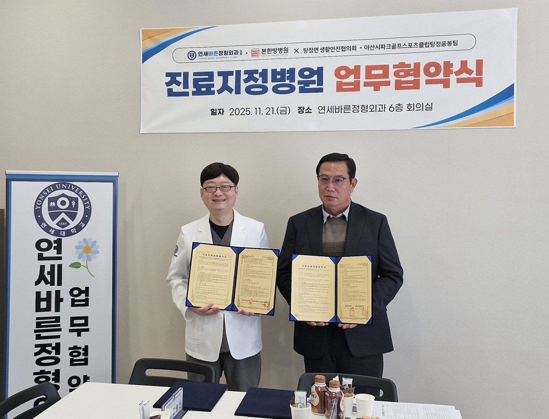 [세종타임즈] 탕정면 생활안전협의회와 아산시파크골프스포츠클럽은 지난 21일 연세바른정형외과와 지역주민의 건강 증진과 의료서비스 향상을 위한 진료지정병원 업무협약을 체결했다.