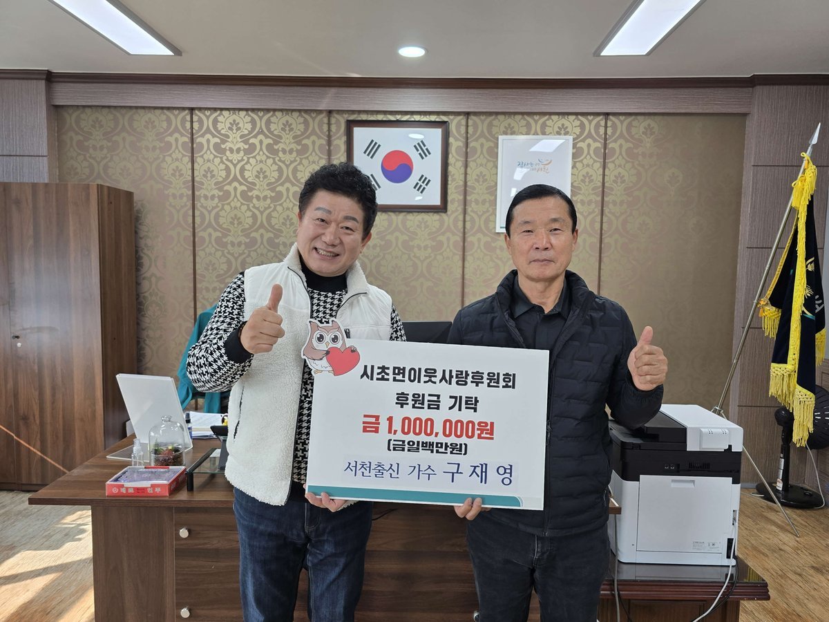 [세종타임즈] 서천군 시초면 출신 가수 구재영 씨가 지역의 취약계층을 돕기 위해 시초면이웃사랑후원회에 후원금 100만원을 기탁했다.
