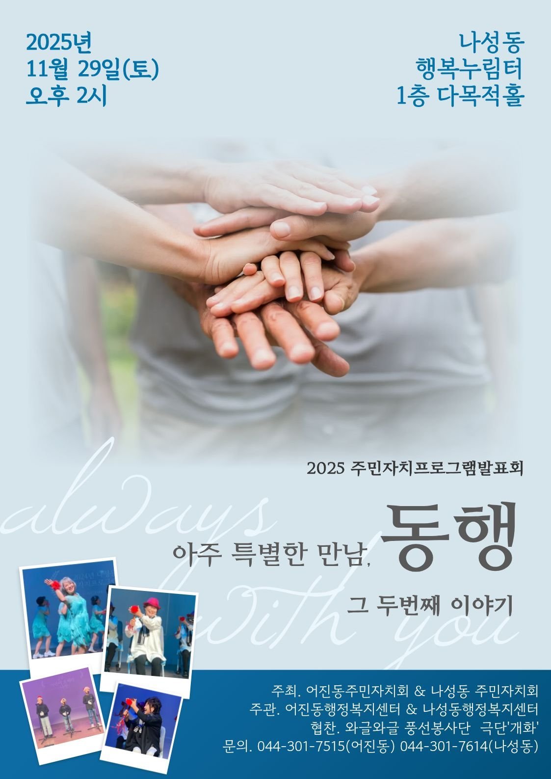 이번 행사는 국학기공, 오카리나, 숟가락 난타, 통기타 등 어진동과 나성동의 주민자치프로그램 수강생들의 공연으로 진행된다.