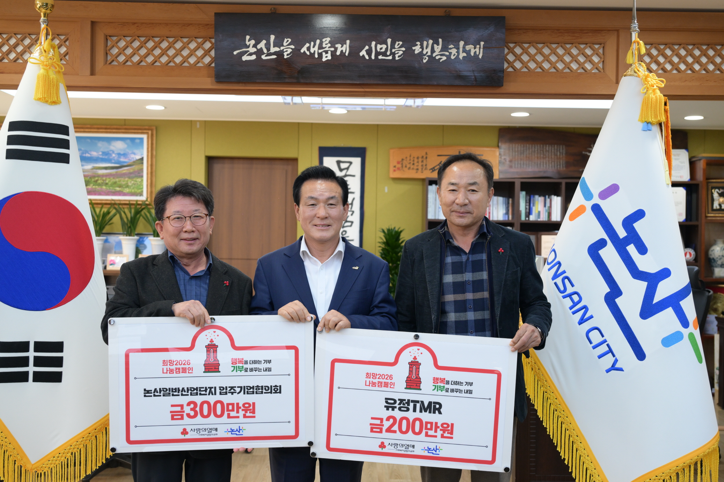 백성현 논산시장은 “논산 지역 경제의 주역으로서 늘 지역에 대한 관심과 따뜻한 나눔을 이어오신 정균철 대표님과 참여 기업들께 진심으로 감사드린다”며 “기탁해주신 성금은 도움이 필요한 곳에 투명하게 사용될 수 있도록 최선을 다하겠다”고 밝혔다.