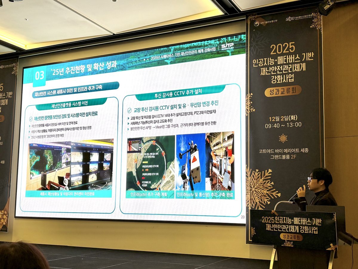 [세종타임즈] 세종특별자치시가 2일 코트야드바이메리어트세종에서 열린 ‘2025년 인공지능·메타버스 기반 재난안전관리체계 강화사업 성과교류회’에서 인공지능 기반 재난안전관리 구축 사례를 공유했다.
