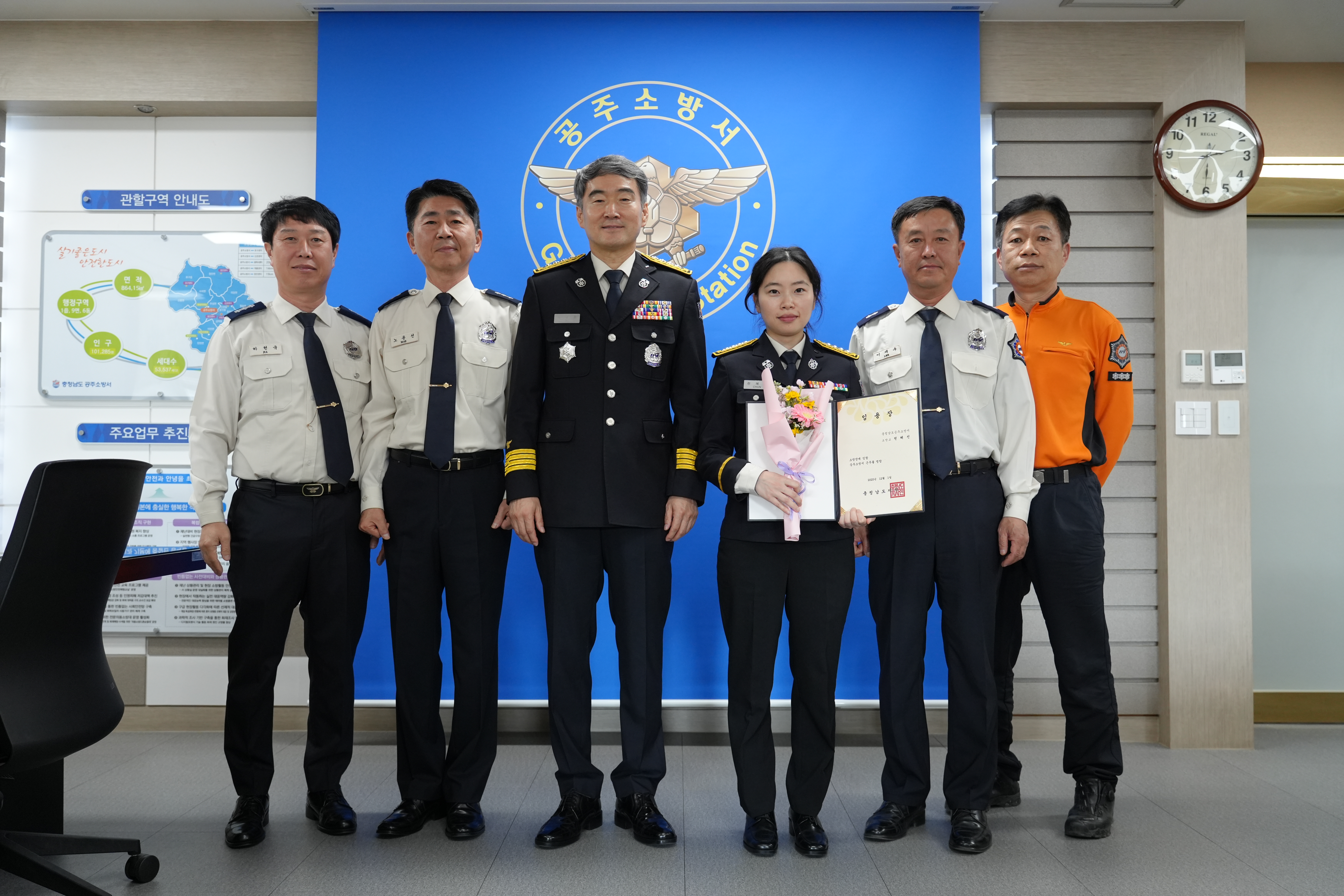 수여식은 임용장 및 계급장 부착, 꽃다발 전달, 기념촬영, 차담회 순으로 진행됐으며, 오긍환 소방서장은 직접 임용장을 수여하며 축하의 뜻을 전했다.
