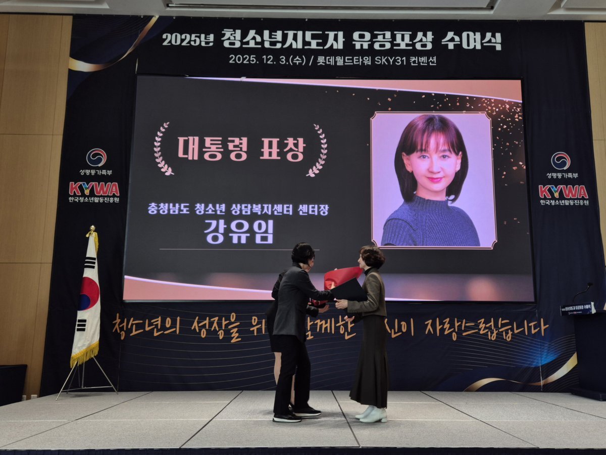 [세종타임즈] 충남사회서비스원은 청소년상담복지센터 강유임 센터장이 3일 서울 롯데타워 SKY31컨벤션에서 열린 ‘2025년 청소년지도자 유공 정부포상 수여식’에서 대통령 표창을 수상했다고 밝혔다.