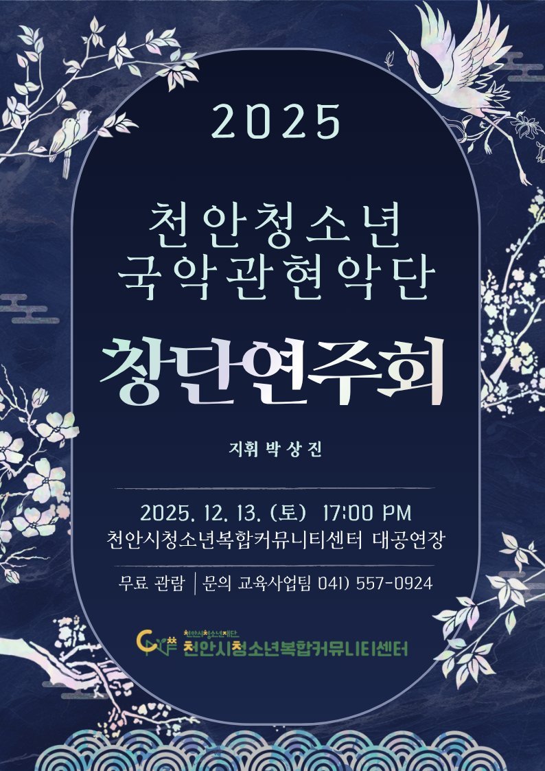 천안청소년국악관현악단은 2025년 8월 30일 창단해 청소년들의 전통문화 예술 역량 강화와 문화 감수성 함양, 건전한 여가문화 형성을 목표로 운영되고 있다.