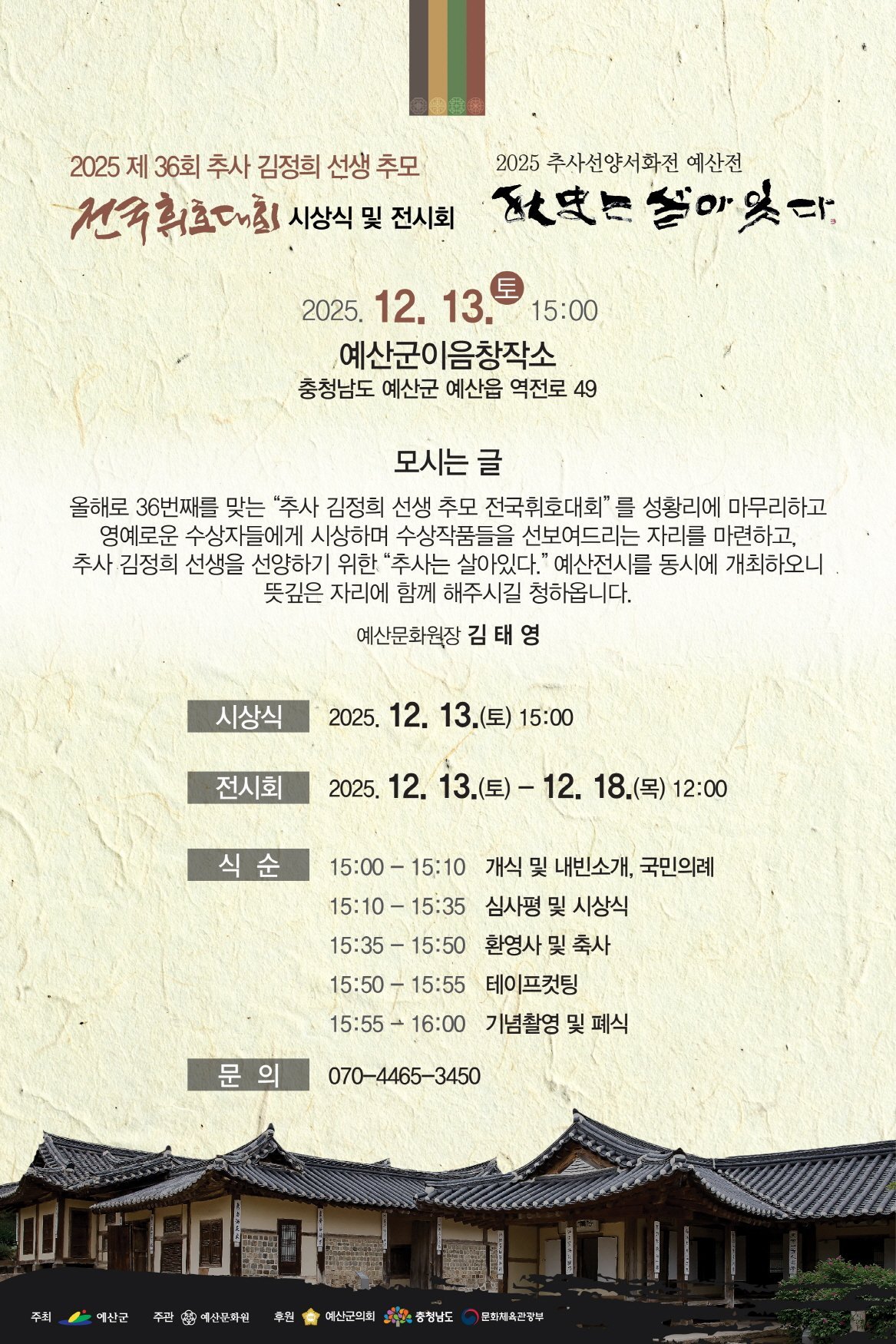 [세종타임즈] 예산문화원은 지난 10월 11일 개최된 ‘제36회 추사김정희선생 추모 전국휘호대회’시상식을 오는 12월 13일 예산군 이음창작소에서 진행한다고 밝혔다.