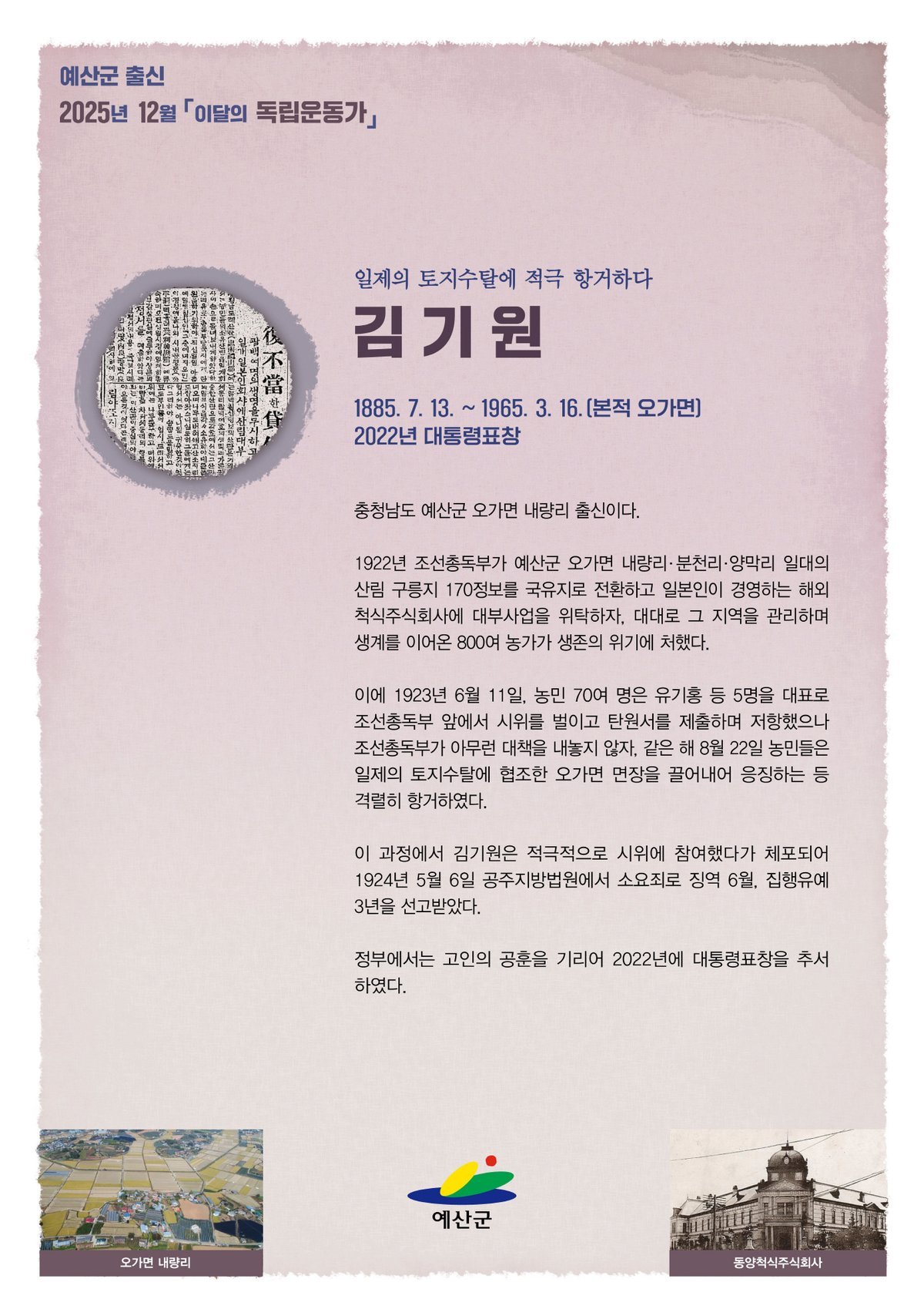 [세종타임즈] 예산군은 오가면 내량리 출신 김기원 선생을 2025년 12월 ‘이달의 독립운동가’로 선정했다고 밝혔다.