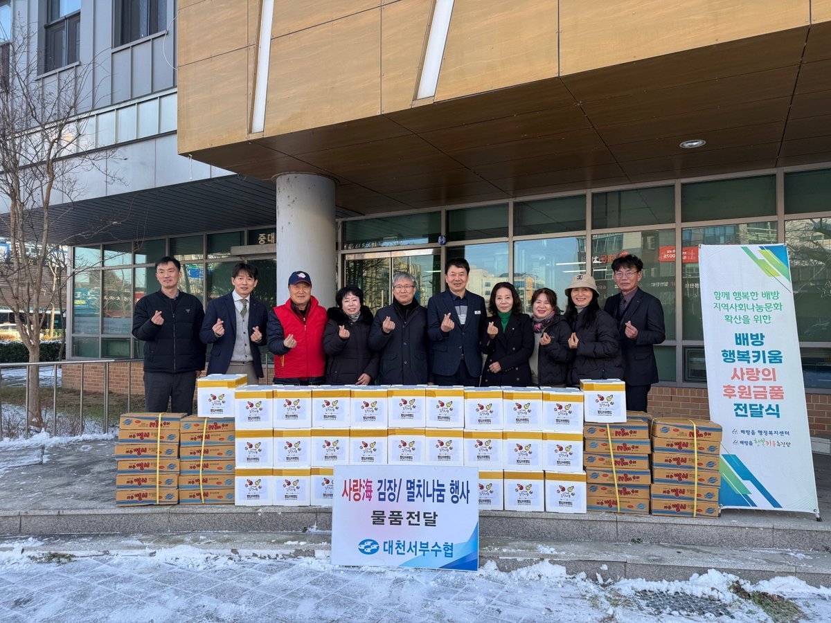 [세종타임즈] 대천서부수협 아산배방지점은 4일 배방읍 행복키움추진단에 김장김치 5kg 30박스와 멸치 1.5kg 30박스를 기부했다.