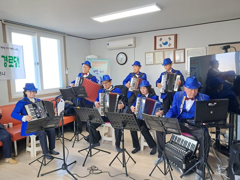 ‘백제하모니’는 공주와 세종, 부여 지역의 퇴직자들로 구성된 음악 동호회로, 이날 경로당을 찾아 어르신들에게 흥겨운 아코디언 공연을 선사했으며 지역 가수들도 함께 노래 공연을 펼쳐 큰 호응을 얻었다.