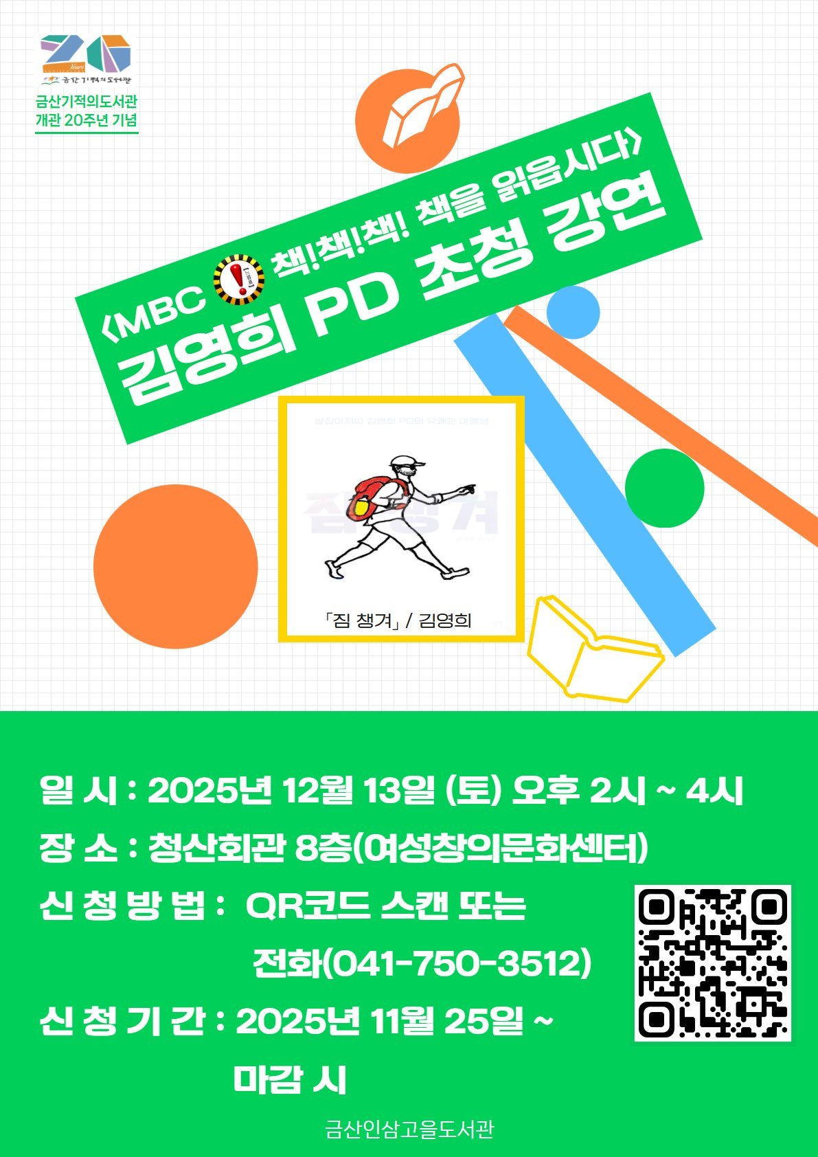 도서관 관계자는 “이번 강연은 금산기적의도서관이 걸어온 20년의 의미를 군민과 함께 되새기고 금산군이 첫 선정 지역이 된 이야기를 직접 듣는 시간을 제공할 것”이라며 “지역에 남긴 가치와 앞으로의 20년을 함께 그려보는 이번 강연에 많은 관심과 참여를 바란다”고 전했다.