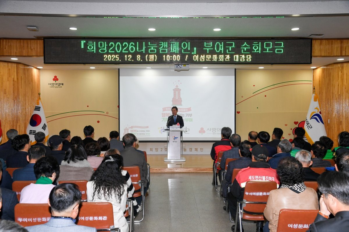 [세종타임즈] 부여군 은 ‘행복을 더하는 기부, 기부로 바꾸는 부여 ’라는 구호 아래 「 희망 2026 나눔 캠페인 」 순회 모금 행사를 지난 8일 여성문화회관 3층 대강당에서 개최했다.