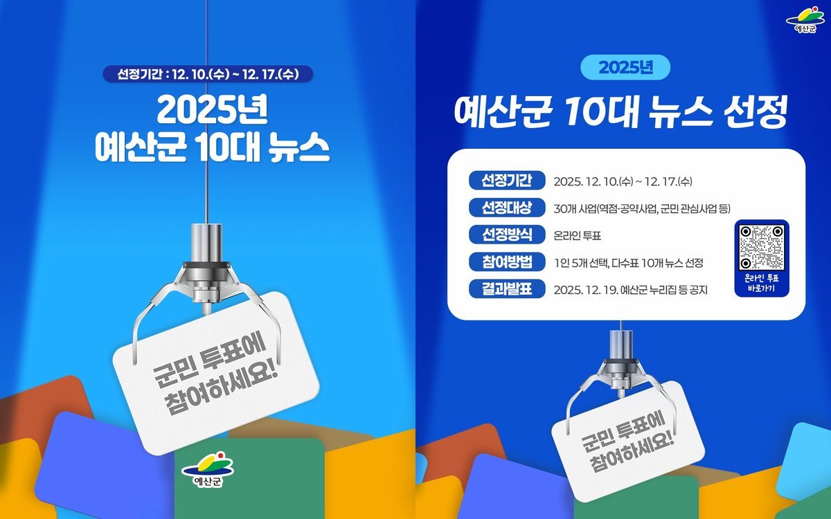 [세종타임즈] 예산군은 2025년 한 해를 빛낸 주요 성과를 군민과 직원의 투표를 통해 선정하기 위해 ‘2025년 예산군 10대 뉴스 선정’을 추진한다고 밝혔다.