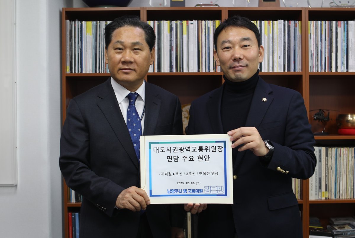 [세종타임즈] 더불어민주당 김용민 국회의원은 오늘 국토교통부 대도시권광역교통위원회 위원장을 만나 △지하철 6호선 남양주 연장 △지하철 3호선 남양주 연장 △면목선 남양주 연장 등 남양주 핵심 철도 현안에 대해 집중 논의하고, 제5차 대도시권 광역교통 시행계획에의 반영과 대광위의 적극적인 권한 행사 및 조정 역할을 강력히 요청했다.