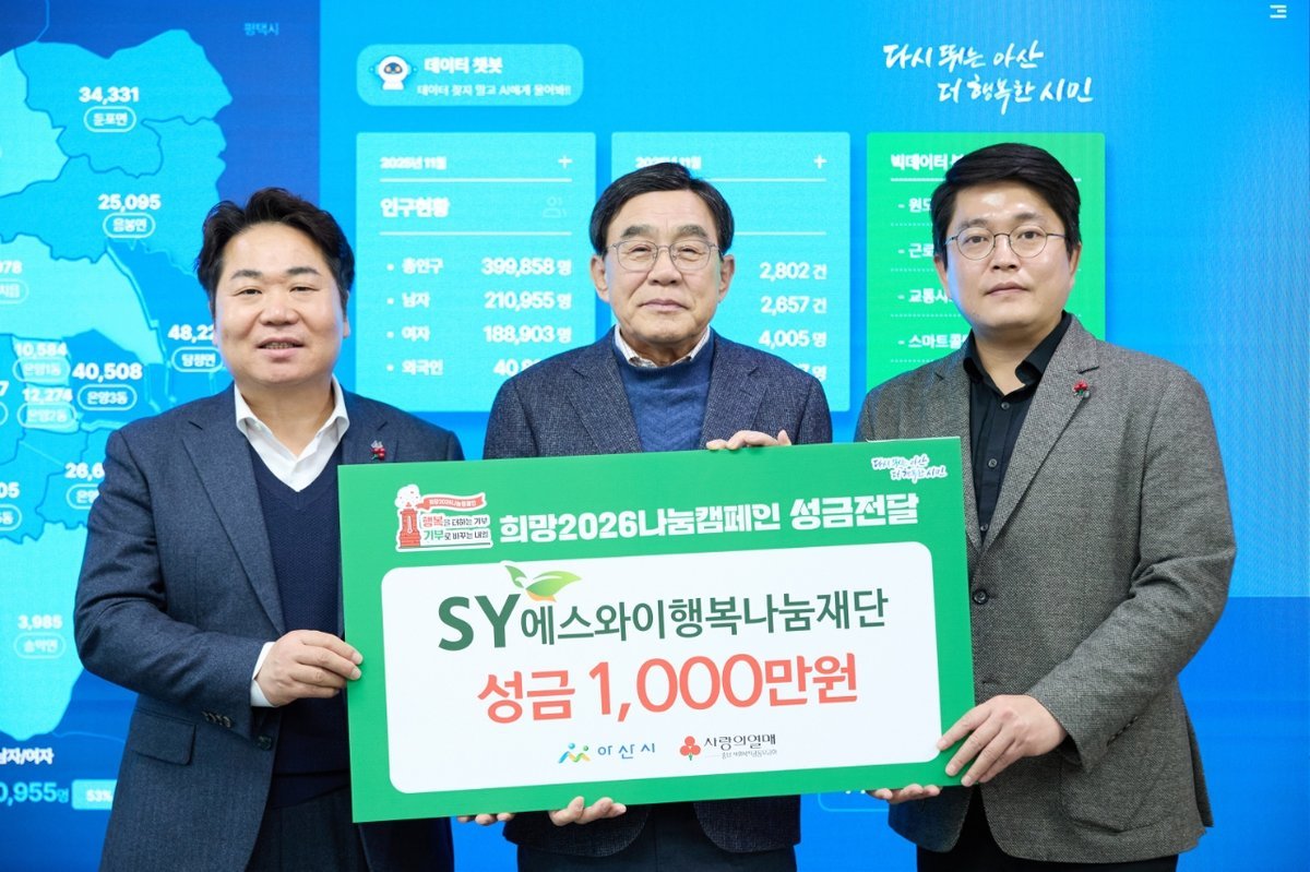 [세종타임즈] 에스와이행복나눔재단이 15일 아산시에 방문해 ‘희망2026나눔캠페인’성금 1000만 원을 기탁했다.