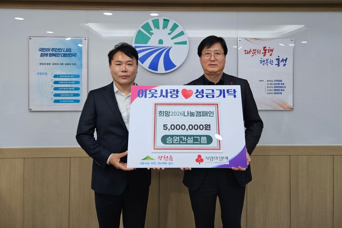 [세종타임즈] 홍성군은 지난 16일 승원건설그룹이 광천읍에 방문하여 ‘희망2026 나눔캠페인’이웃사랑 성금 500만원을 기탁했다고 밝혔다.